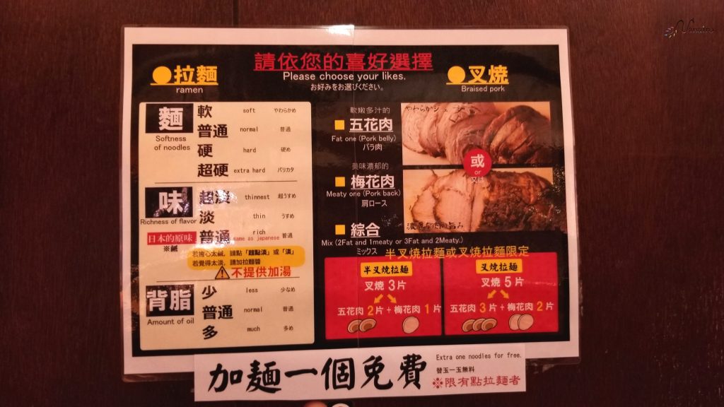 ラーメンを注文すると、「麺の硬さ」「味の濃さ」「背油の量」「チャーシューの種類」を店員さんから聞かれますので、画像の表を見ながら選びます。