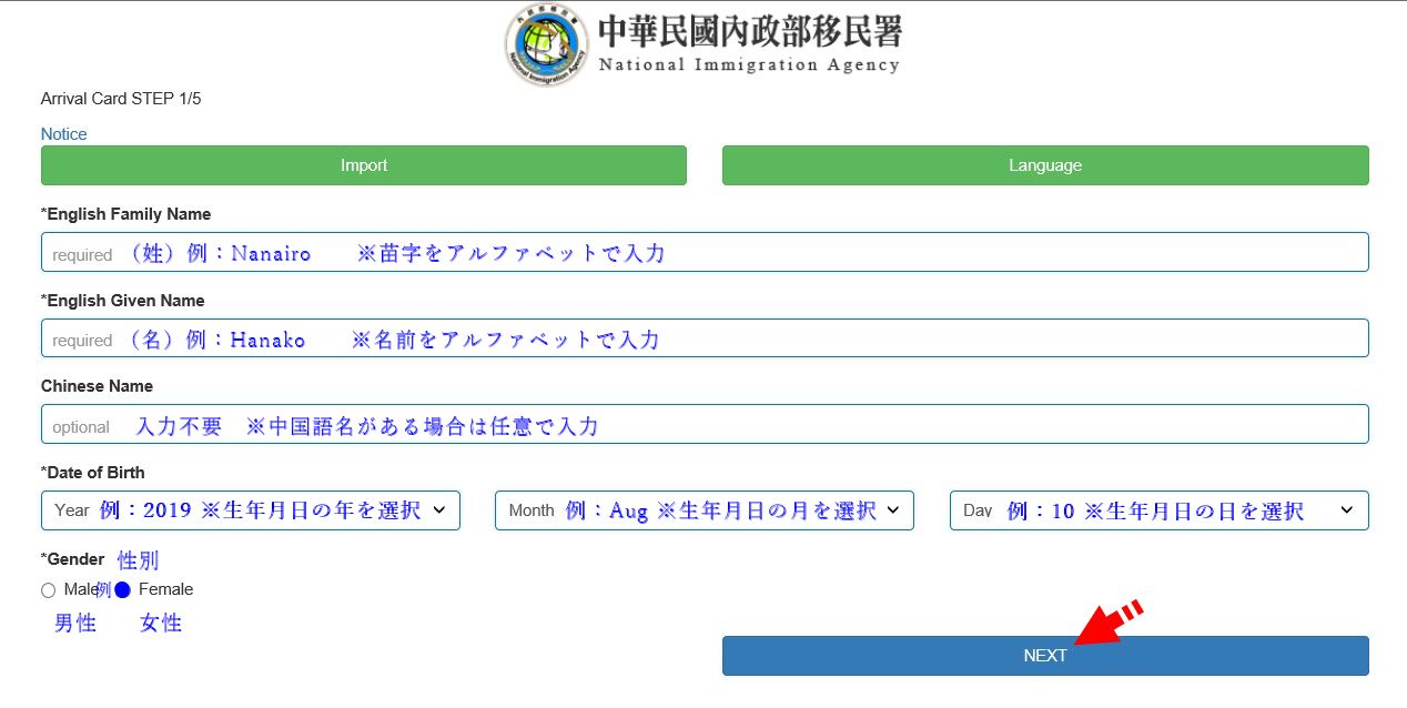 ⑦各項目(搭乗便名、入国年月日、渡航目的、職業)を全て入力&選択した後に、「NEXT」をクリックします。
