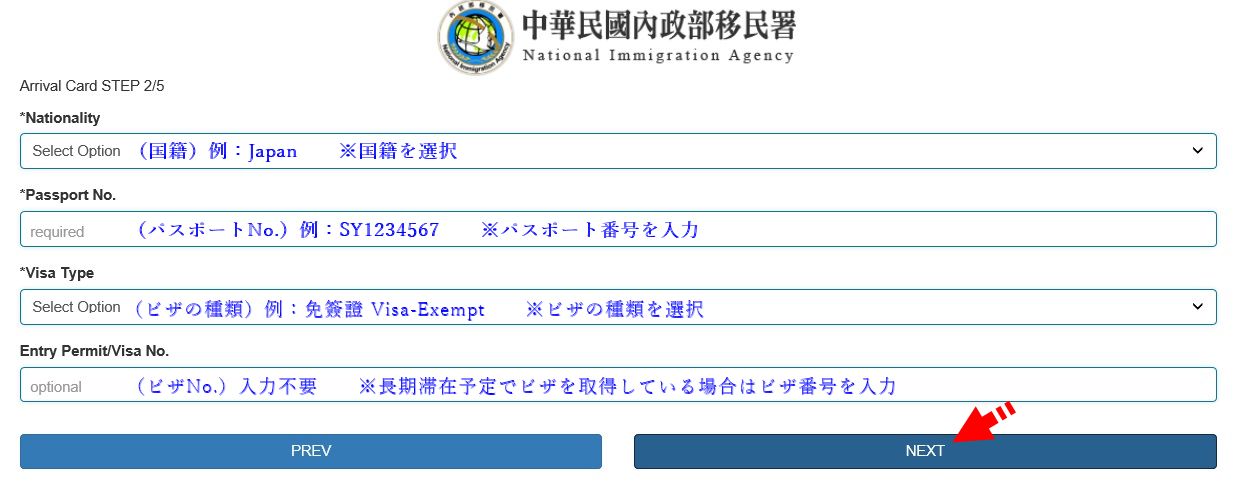 ⑤各項目(国籍、パスポートNo、ビザの種類、ビザがある場合はビザNo)を全て入力&選択した後に、「NEXT」をクリックします。