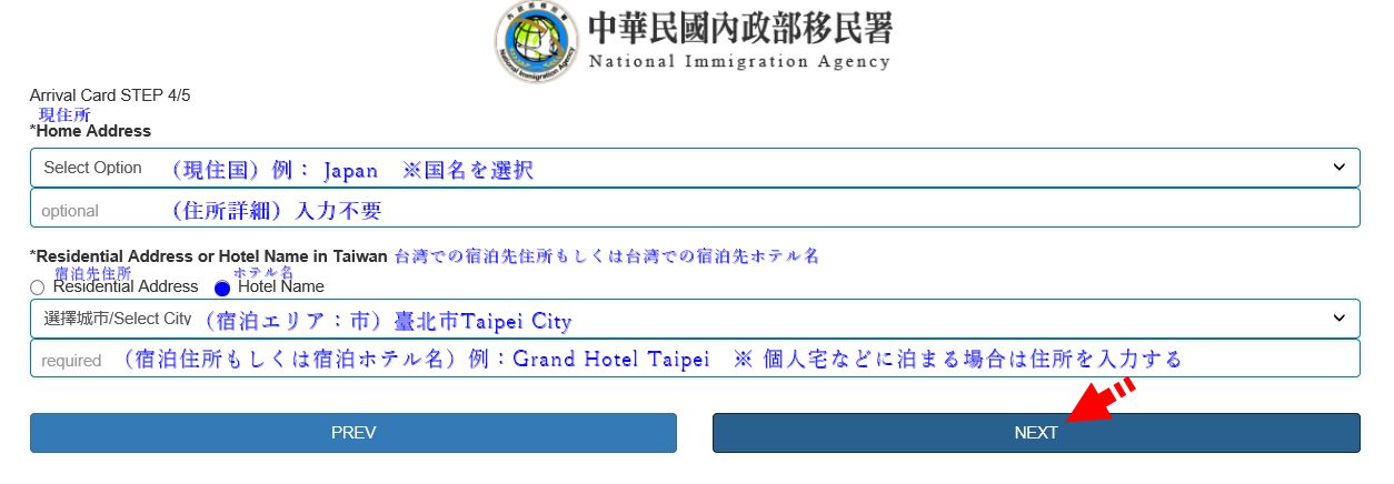 ⓽各項目(現住国、宿泊先住所もしくは宿泊先ホテル名)を全て入力&選択した後に、「NEXT」をクリックします。