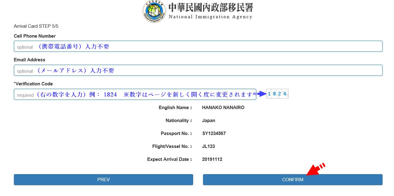 ⑩上記の申請ページ(Arrival Card STEP 5/5)が表示されます。