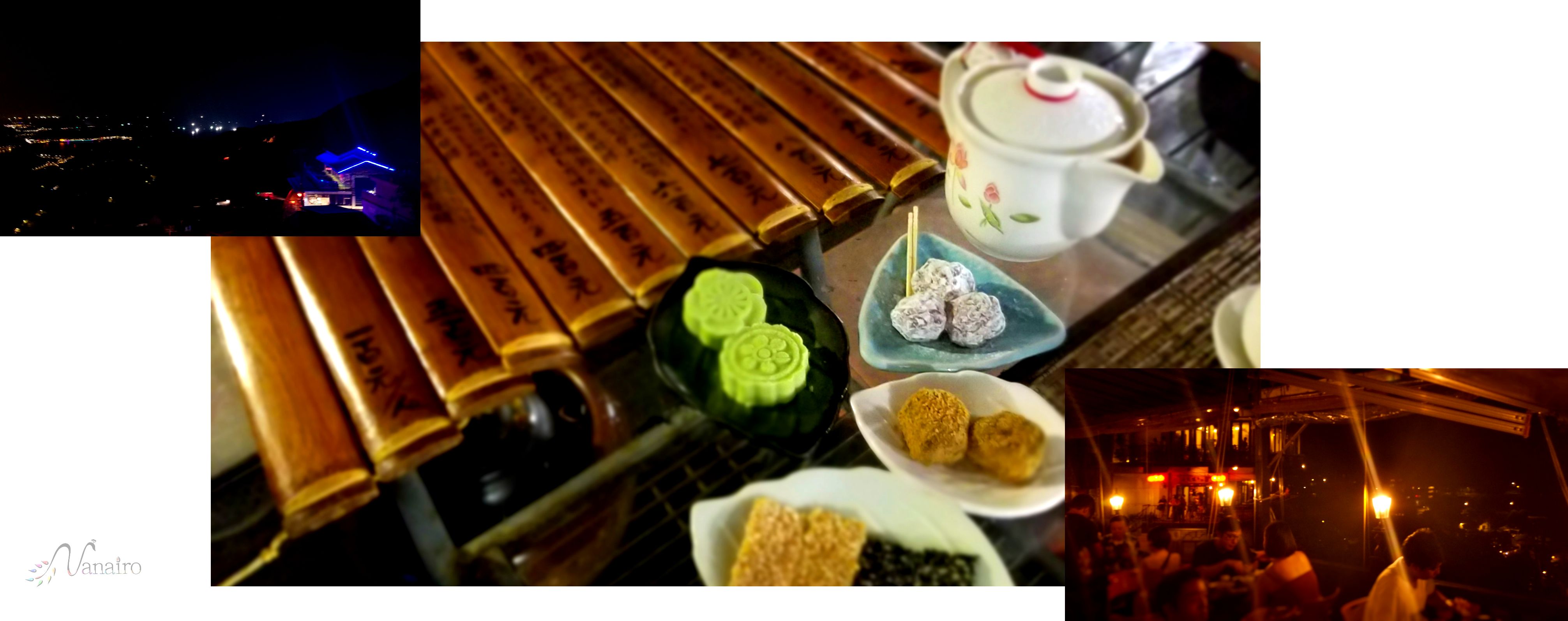 九份は人通りが多くなってくると、階段を1歩進めるのも一苦労をいうほどに混雑しますので、疲れた身体を癒す意味でも屋外のテラス席から見る夜景と、お茶や茶菓子はとてもおすすめです。