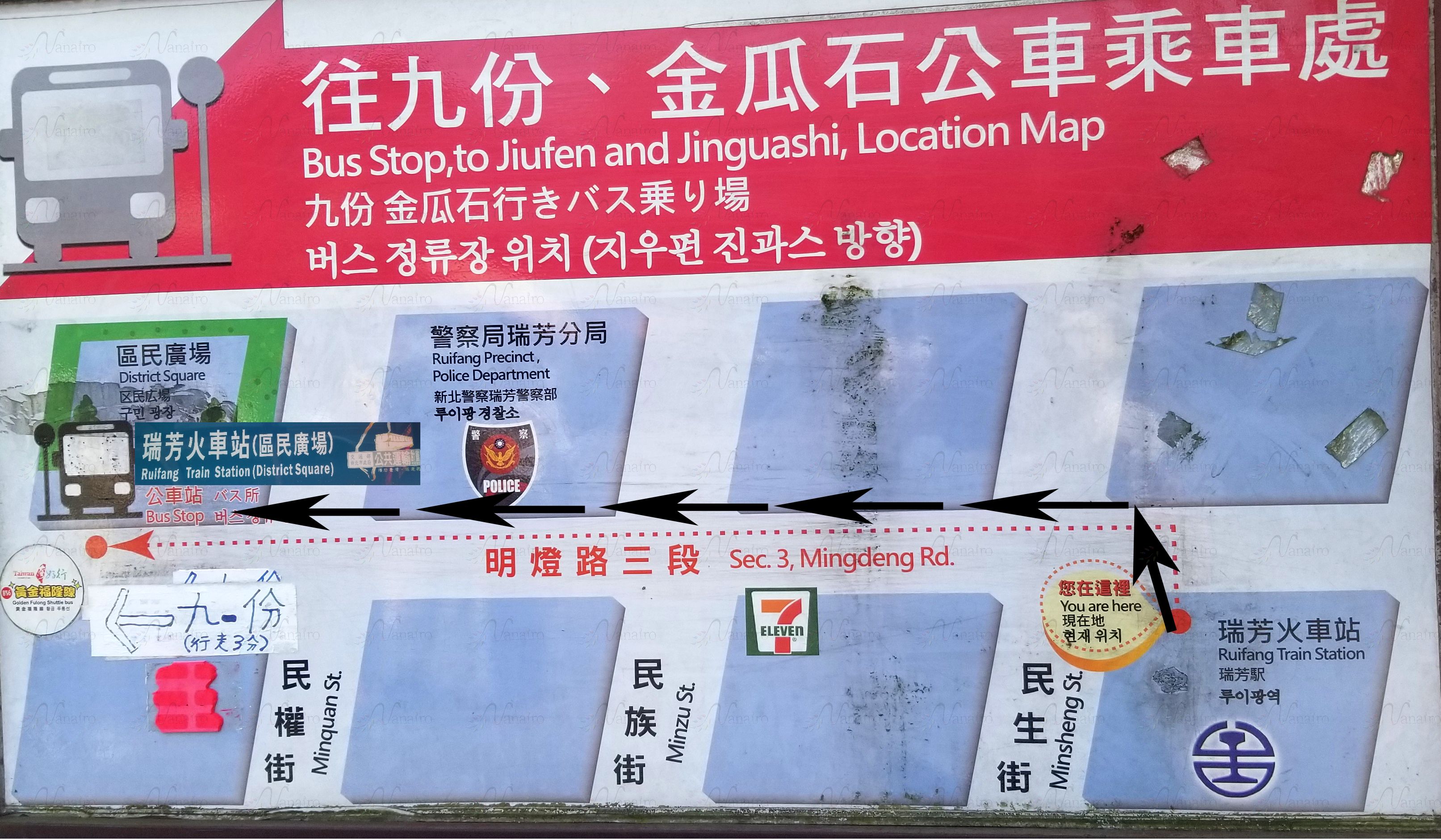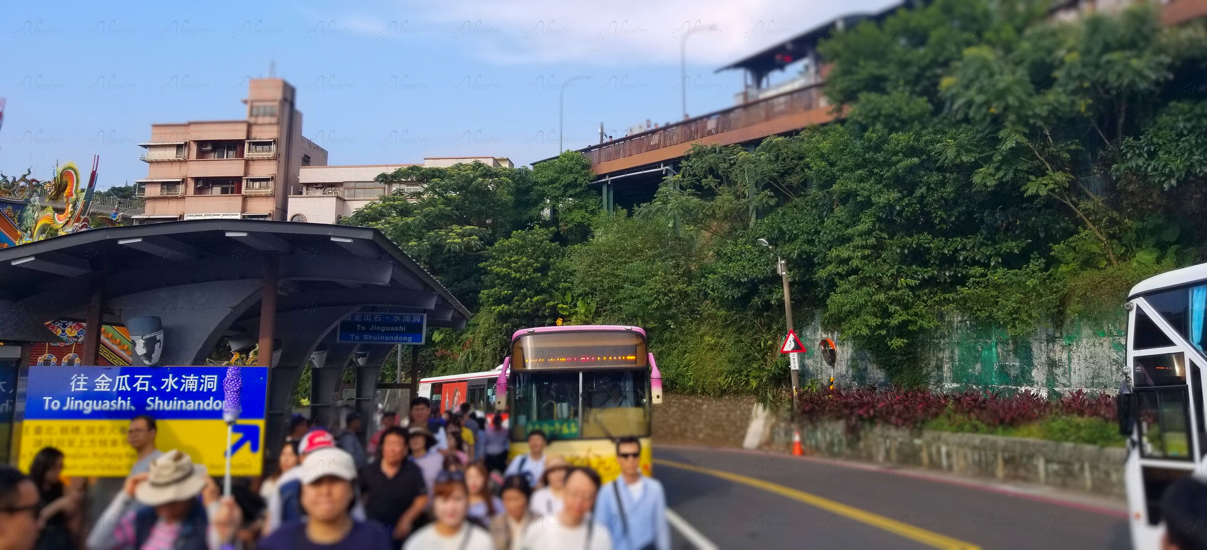2番出口からでると「1062番線 九份・金瓜石(ジゥフェン・ジングァシー:jiǔfèn・jīnguāshí)」行きのバス停がありますので、そこからバスに乗車します。
