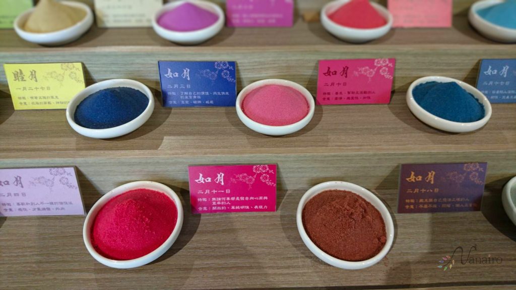 お皿に盛られたカラフルな生日彩鹽(誕生日塩)には、それぞれに月日と説明が書いてあります。